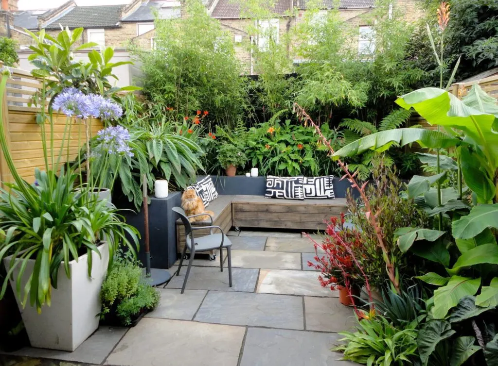The varying palette of natural Indian sandstone paving is ideally suited to compact spaces where a single tone would make an already small space look and feel even smaller, and perhaps even a little claustrophobic. By using sandstone, with a variety of grey, brown and orange tones, you can create a cosy area that's complemented with minimal furnishings and vibrant planting.