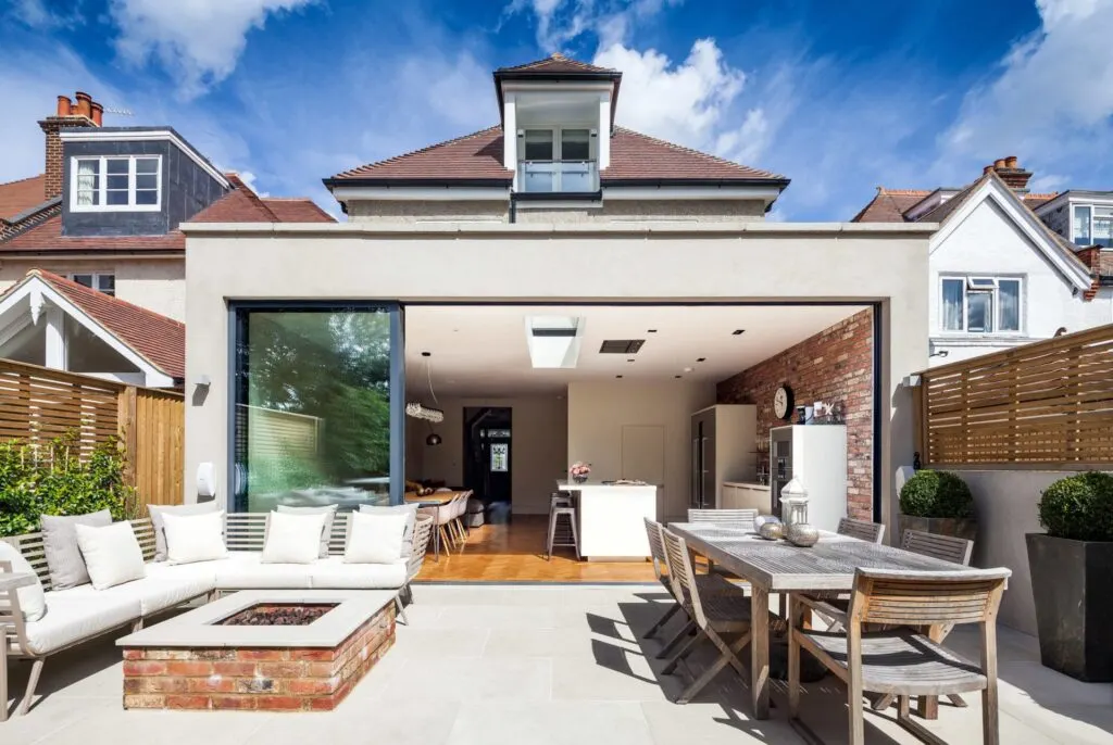 If you're seeking a truly contemporary finish, sawn and honed sandstone in varying light grey tones is a brilliant choice – especially in an urban landscape. Just like the above garden, you can use Indian sandstone to complement an extension and even as an edging to your fire pit or planting area.