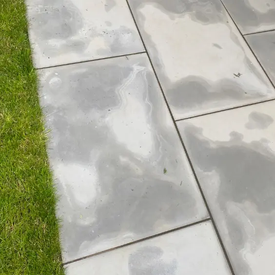 Patches around the edges of the slabs are referred to as ‘Picture Framing’ and are due to moisture being drawn into the slabs from the jointing compound or mortar base around the edges. On a warm and dry day, this picture framing will usually dry out but can appear again in wet or humid conditions as more moisture is drawn back into the slab. The natural porosity of the stone will determine the extent of the patches and will vary from slab to slab.