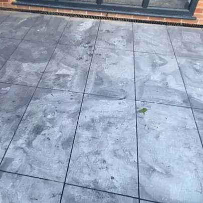 Two-part brush-in jointing compounds are often used for patio installations as they create a good, strong joint that can withstand the effects of pressure washers and other potential erosion. Once the grout is mixed, it has a limited working time. It’s generally applied to a wet surface and brushed into the joints. The pavers are then rinsed and swept. Often, a white residue remains on the surface of the tile which can be very difficult to remove, especially on textured surfaces.