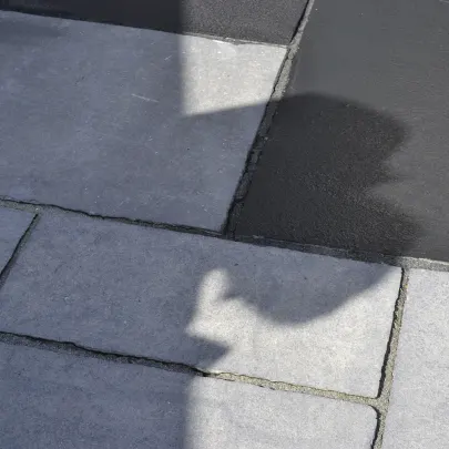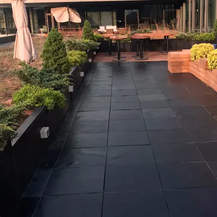 Staining and fading can occur in dark natural stones through everyday use and it is widely acknowledged that black stone paving can gradually fade over time. This is due to a chemical reaction with rain which is slightly acidic. Natural UV light will also play a part in causing dark stones to lose their colour and gradually fade to a steel grey shade.
